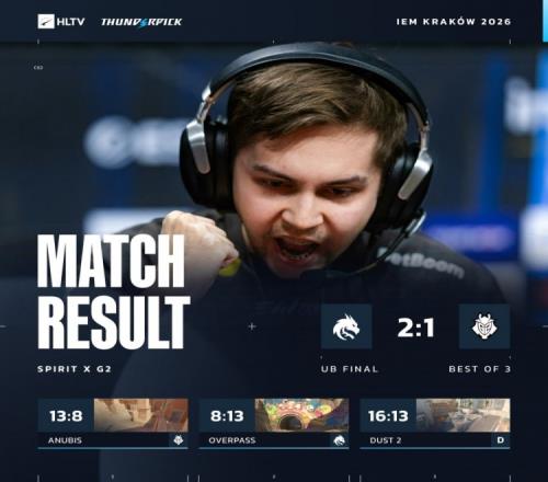 体育播报2月4日宣 CS2重点赛事IEM克拉科夫来到Stage2阶段,Spirit鏖战三图战胜G2,位列A组头名直接晋级四强,G2则将在淘汰赛中对阵Flacons与MOUZ之间的胜者!